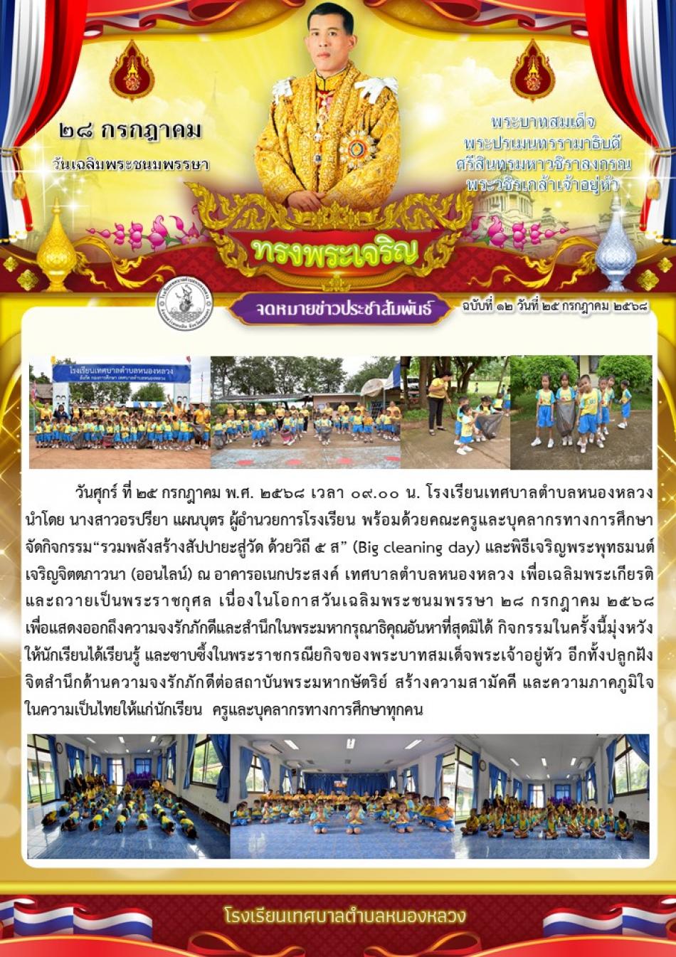 กิจกรรม "รวมพลังสร้างสัปปายะสู่วัดด้วยวิถี 5ส (Big Cleaning Day)" พร้อมด้วยพิธีเจริญพระพุทธมนต์และเจริญจิตตภาวนา เนื่องในโอกาสวันเฉลิมพระชนมพรรษาสมเด็จพระเจ้าอยู่หัว 28 กรกฎาคม 2568 [25 กรกฎาคม 2568]