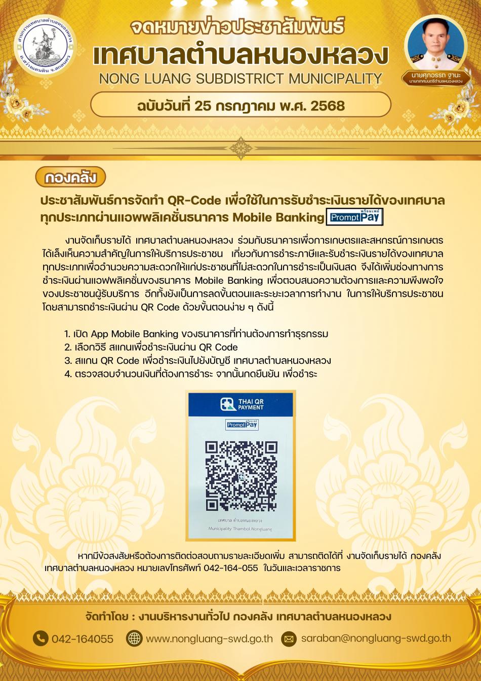 จดหมายข่าวประชาสัมพันธ์การจัดทำ QR-Code เพื่อใช้ในการรับชำระเงินรายได้ของเทศบาลทุกประเภทผ่านแอพพลิเคชั่นธนาคาร Mobile Banking [25 กรกฎาคม 2568]