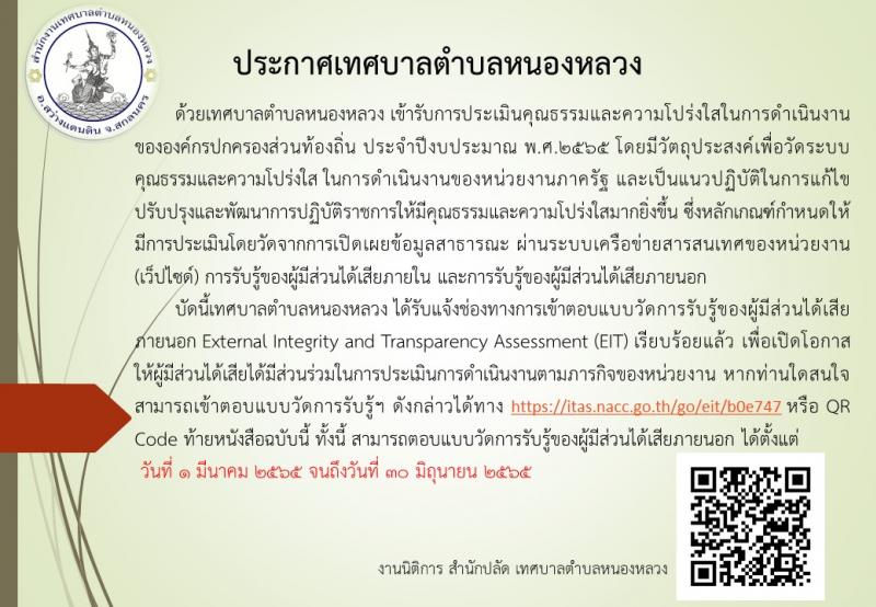 ประกาศเทศบาลตำบลหนองหลวง เรื่อง การประเมินคุณธรรมและความโปร่งใสในการดำเนินงาน (ITA) ประจำปีงบประมาณ 2565 (สำหรับผู้มีส่วนได้เสียภายนอก (EIT))