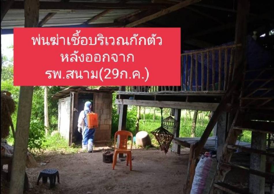 เจ้าหน้าที่ทำการฉีดพ่นฆ่าเชื้อ รอบบริเวณสถานที่กักตัวหลังเข้ารับการรักษาโควิด-19 จากโรงพยาบาลสนาม [29 กรกฎาคม 2564]