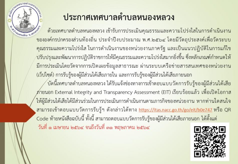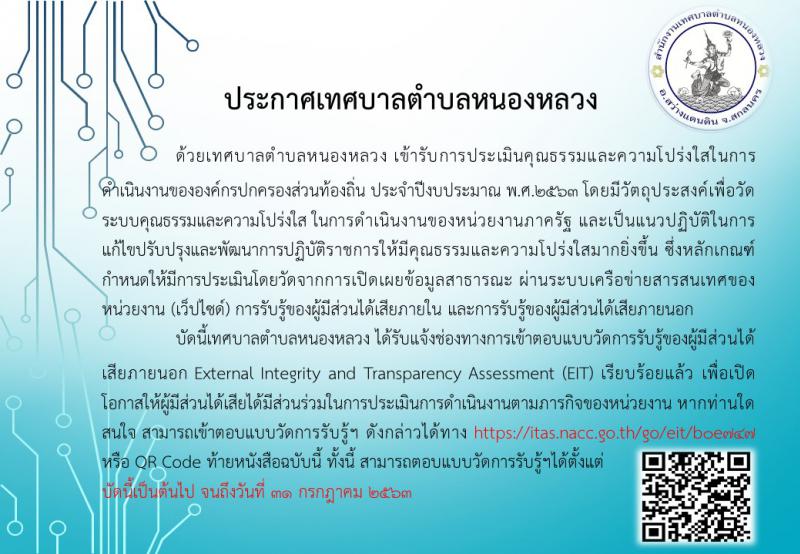ประกาศเทศบาลตำบลหนองหลวง เรื่อง การประเมินคุณธรรมและความโปร่งใสในการดำเนินงาน (ITA) ประจำปีงบประมาณ 2564 (สำหรับผู้มีส่วนได้เสียภายนอก (EIT)) [30 มีนาคม 2564]
