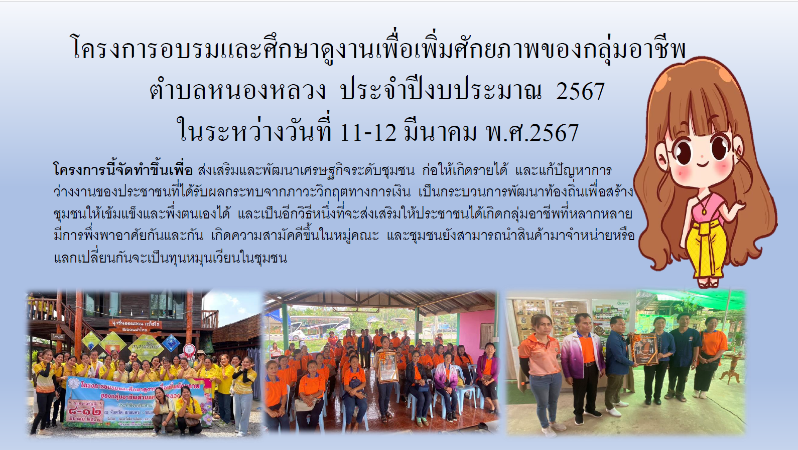 โครงการอบรมและศึกษาดูงานเพื่อเพิ่มศักยภาพของกลุ่มอาชีพตำบลหนองหลวง ประจำปีงบประมาณ 2567 [15 มีนาคม 2567]
